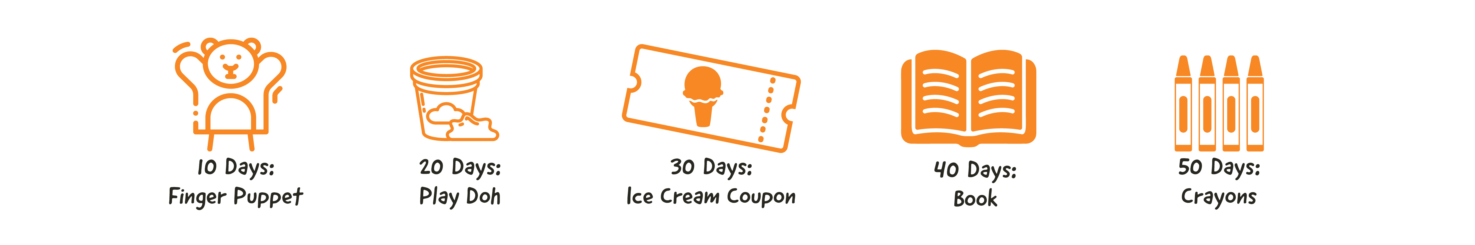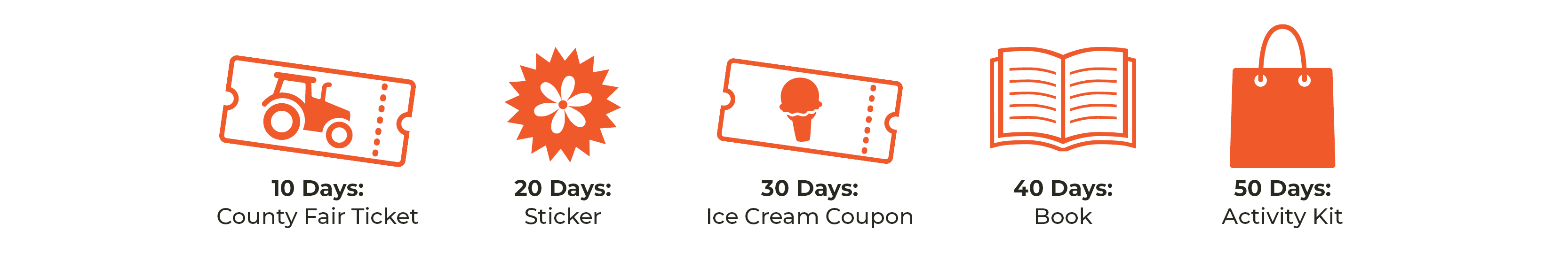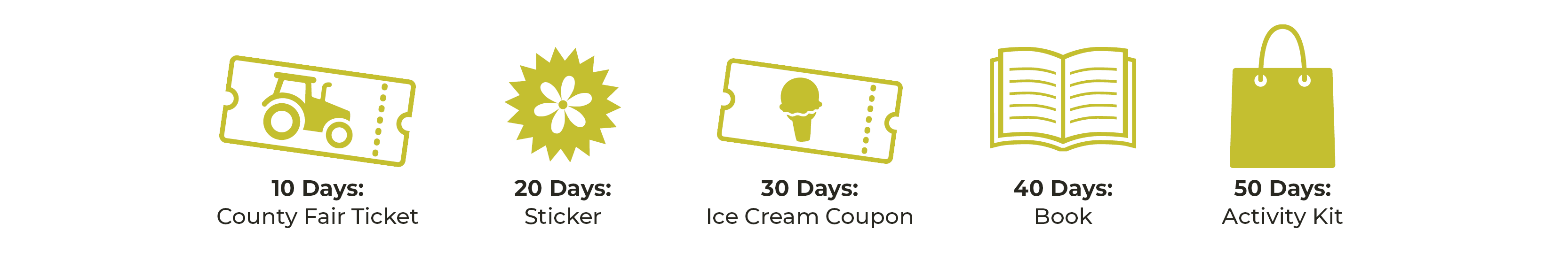 Use your log to keep track of each day that you read with your child this summer, and complete fun reading challenges. For every 10 days of reading, visit the library to receive the following reading rewards: